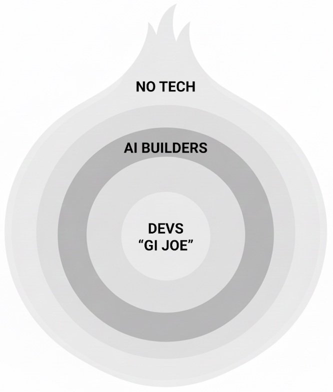 Y en la capa de afuera están todos los demás, tu equipo que no tiene conocimiento técnico. Pero que si los acompañas y los guias pueden crear sus automatizaciones y convertirse en personas muchísimo más eficientes por sí solos resolviendo los problemas de su propio metro cuadrado usando AI.